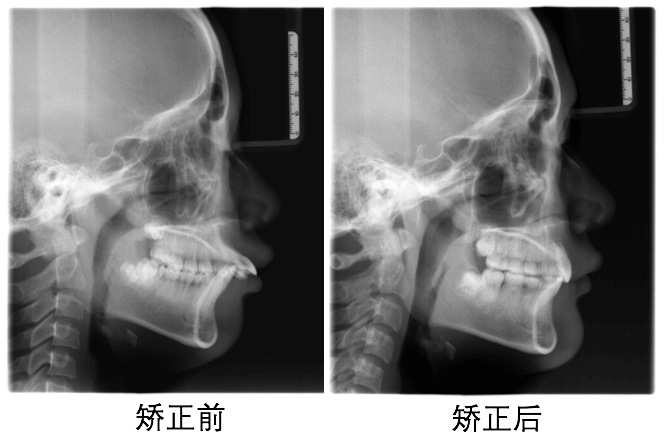 矫正后,上门牙及上嘴唇内收,鼻唇角明显加大,下巴较之前也更为明显。X光片中的前后变化一目了然。